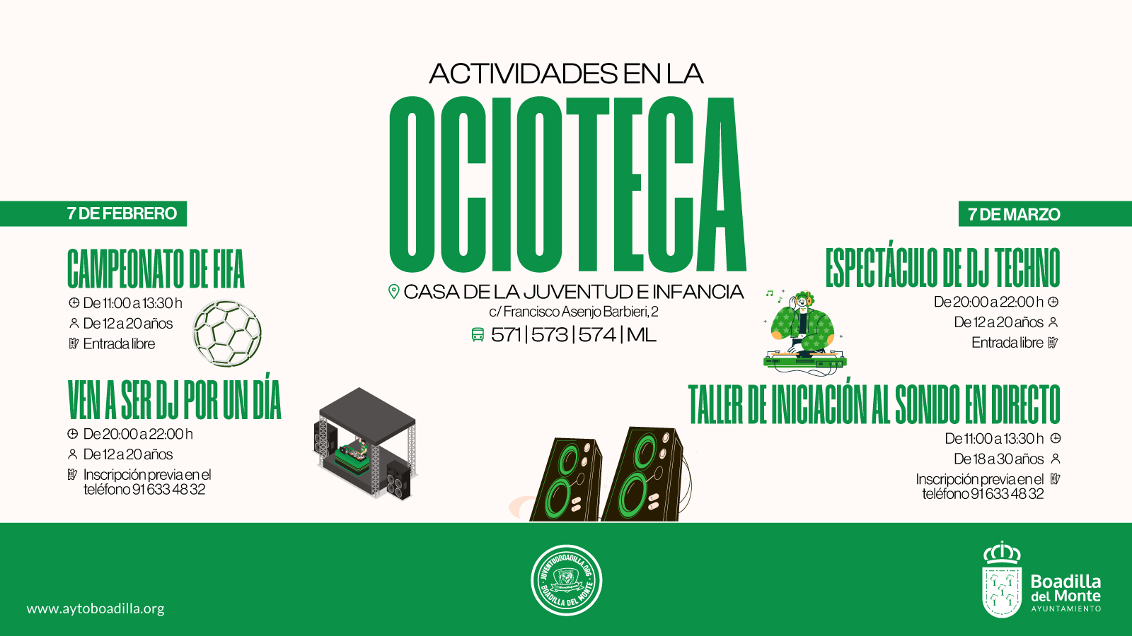 La Ocioteca de la Casa de la Juventud e Infancia ofrece cuatro actividades lúdicas que se desarrollarán los días 7 de febrero y 7 de marzo. La primera de ellas, el 7 de febrero, es un Campeonato de FIFA, que se celebrará de 11:00 a 13:30 horas, dirigido a jóvenes de entre 12 y 20 años, con entrada libre. Por la tarde, de 20:00 a 22:00 horas, se ofrecerá  Ven a ser DJ por un día, también dirigida a jóvenes de 12 a 20 años. Esta actividad requiere de inscripción previa en el teléfono 91 633 48 32.
