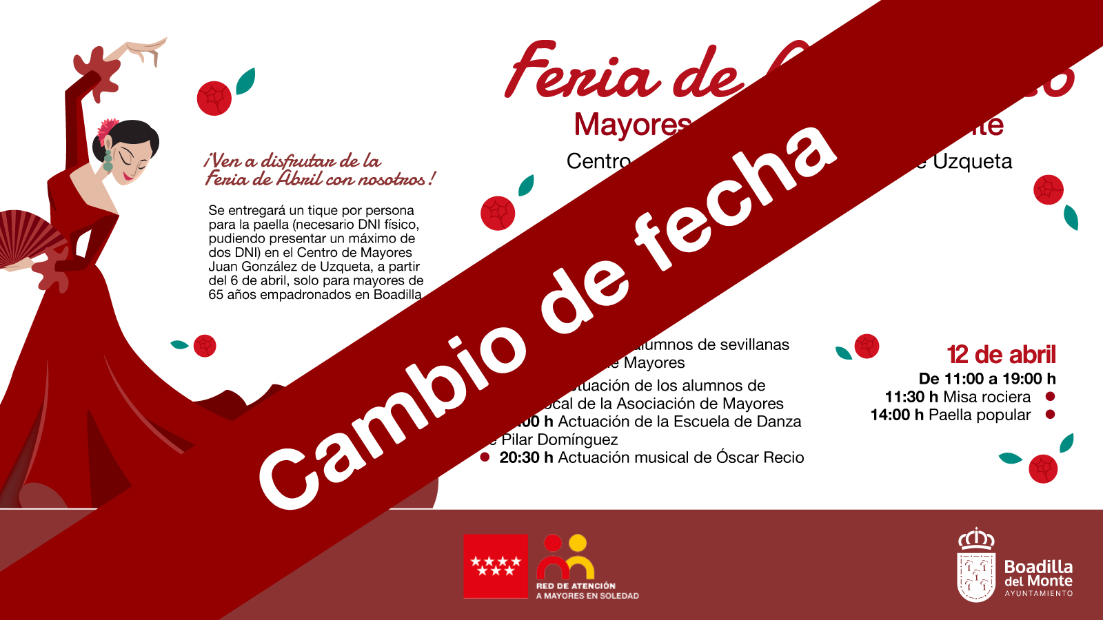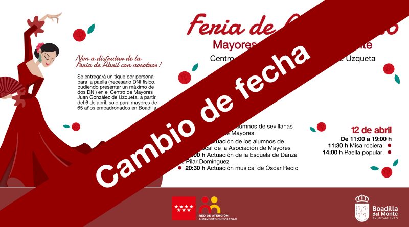 El Ayuntamiento de Boadilla ha optado por posponer la Feria de Abril destinada a los vecinos mayores de 65 años ante la previsión de condiciones meteorológicas desfavorables para el próximo fin de semana. Las lluvias y las rachas de viento previstas han llevado a tomar esta decisión con carácter preventivo.