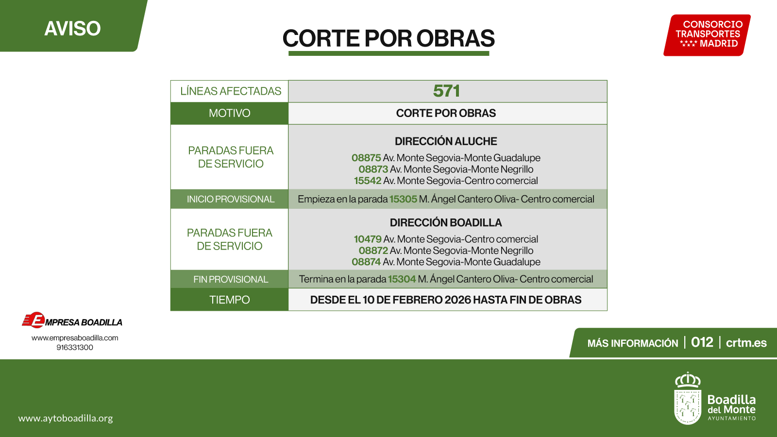La línea interurbana 571 Madrid (Aluche) – Boadilla del Monte verá modificado temporalmente su itinerario habitual debido a las obras de mejora que se están llevando a cabo en la avenida Monte Segovia. Estos trabajos obligan al corte de tráfico en un tramo de la vía, lo que conlleva ajustes en el recorrido y la eliminación provisional de varias paradas.