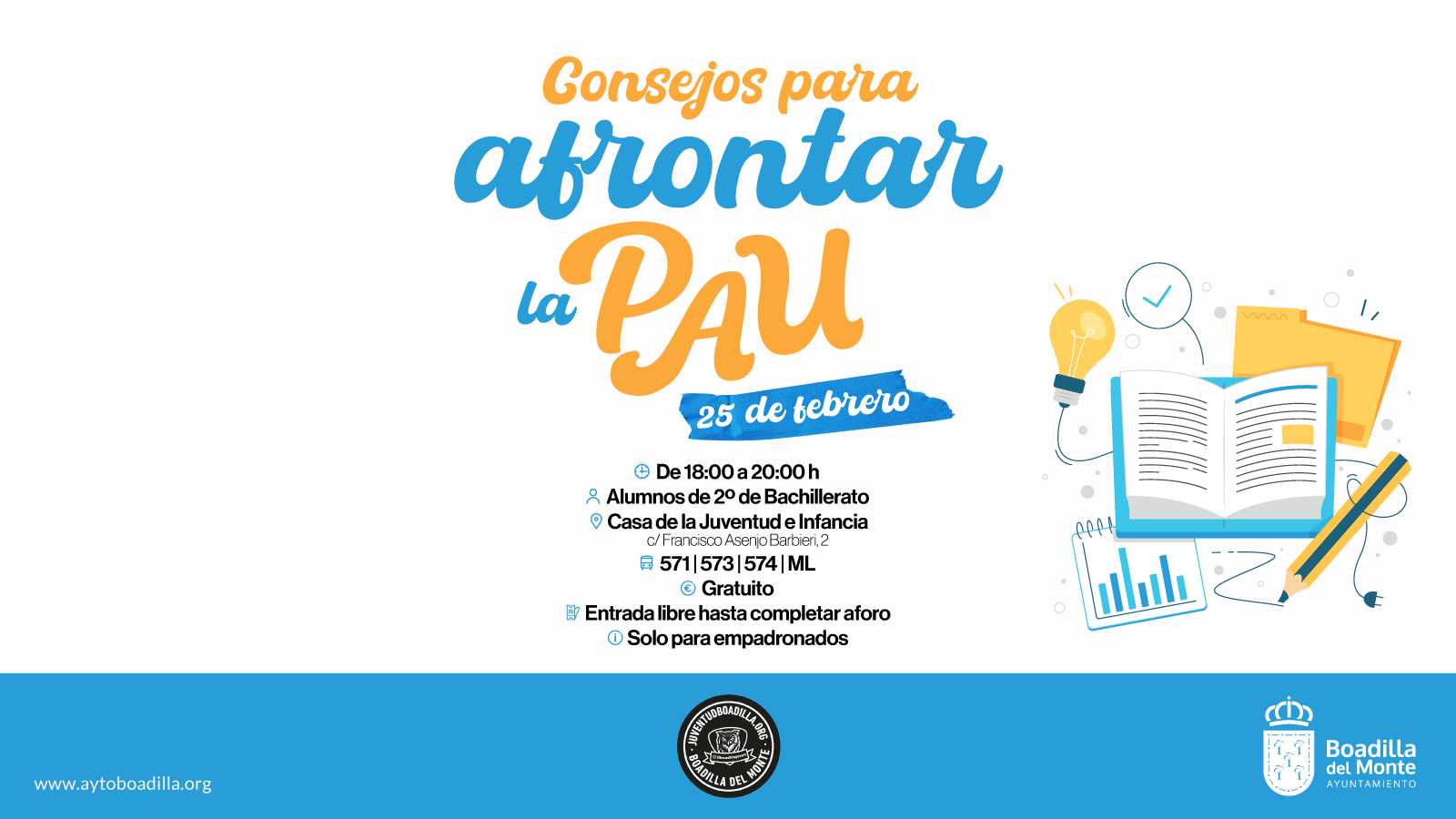 El Ayuntamiento de Boadilla ofrecerá el próximo miércoles, 25 de febrero, una sesión dirigida a alumnos de 2º de Bachillerato en la que recibirán consejos sobre cómo afrontar la PAU, a la que tendrán que enfrentarse en pocos meses.