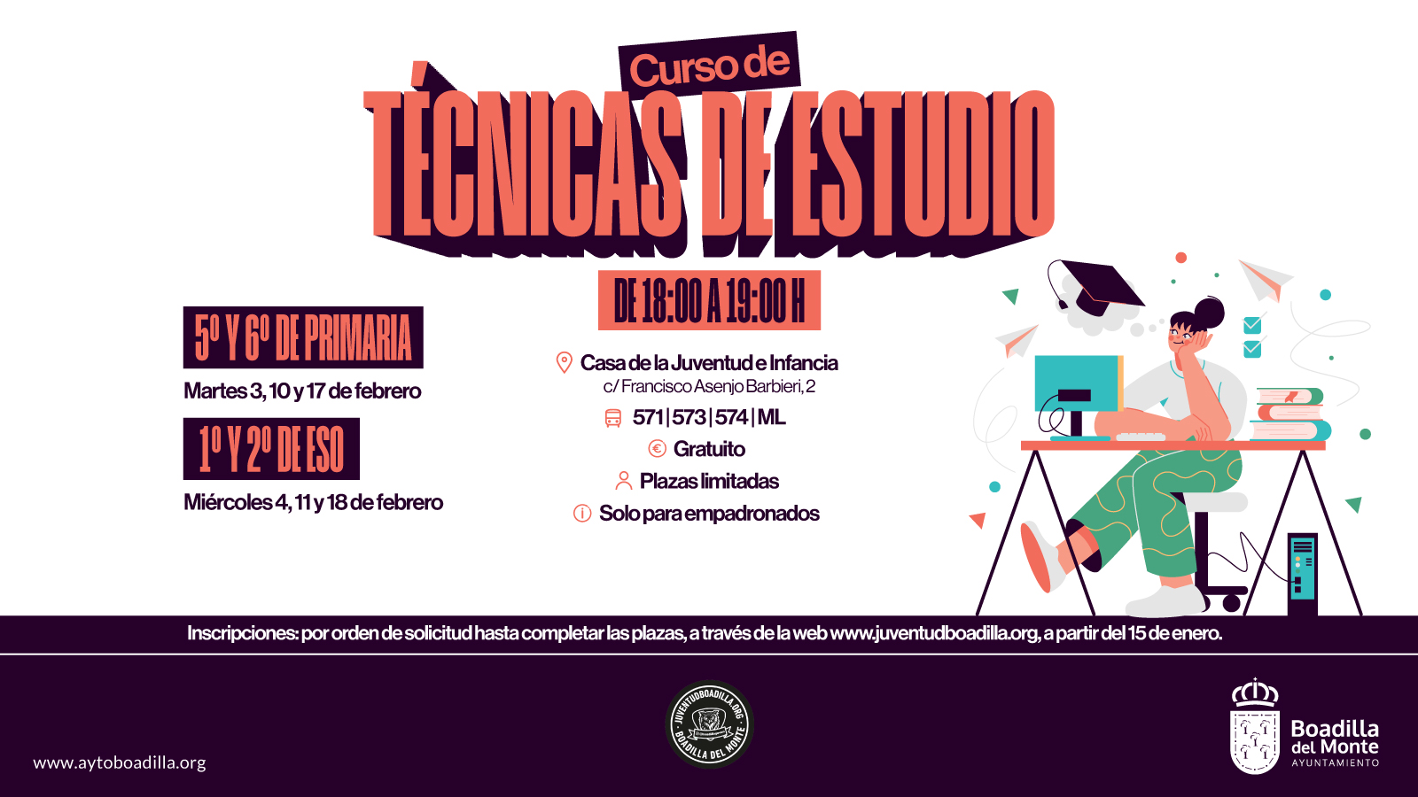 El curso está destinado exclusivamente a jóvenes empadronados en el municipio y requiere inscripción previa. Las solicitudes deben realizarse a través de la página web juventudboadilla.org, y las plazas se adjudicarán por riguroso orden de inscripción hasta completar el aforo disponible.