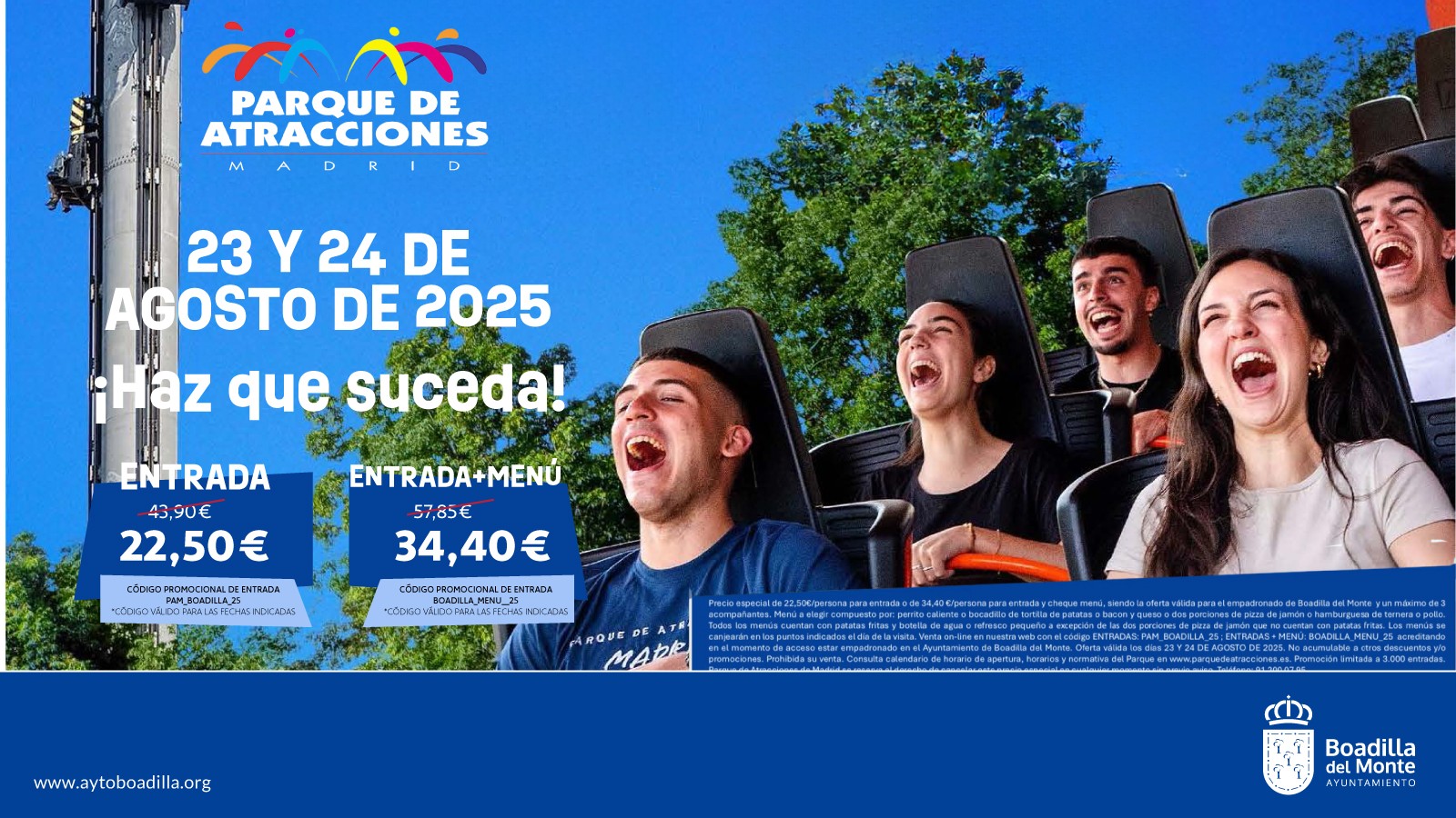 Los empadronados en Boadilla del Monte podrán disfrutar los próximos días 23 y 24 de agosto de precios reducidos en la entrada al Parque de Atracciones. Esta tendrá un coste de 22,50 euros por persona (su precio es de 43,90) y de 34,40 si es con menú (su precio es de 57,85 euros).  El descuento se aplicará a la persona que acredite el empadronamiento y a un máximo de tres acompañantes.