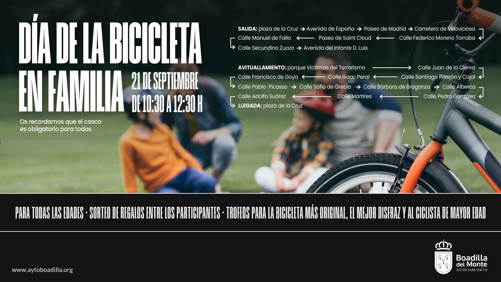 El Ayuntamiento de Boadilla del Monte ha organizado para el próximo domingo, 21 de septiembre, una nueva edición del Día de la Bicicleta en Familia, dentro del marco de actividades de la Semana Europea de la Movilidad. El evento se desarrollará entre las 10:30 y las 12:30 horas.