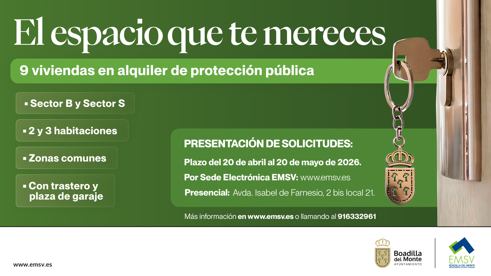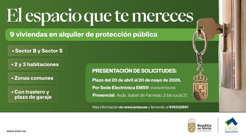 El Ayuntamiento de Boadilla del Monte, a través de la Empresa Municipal del Suelo y la Vivienda (EMSV), ha puesto en marcha un nuevo proceso para facilitar el acceso a la vivienda en régimen de alquiler protegido. Desde hoy y hasta el próximo 20 de mayo, los interesados podrán presentar su solicitud para optar a una de las nueve viviendas disponibles situadas en los sectores B y S del municipio.