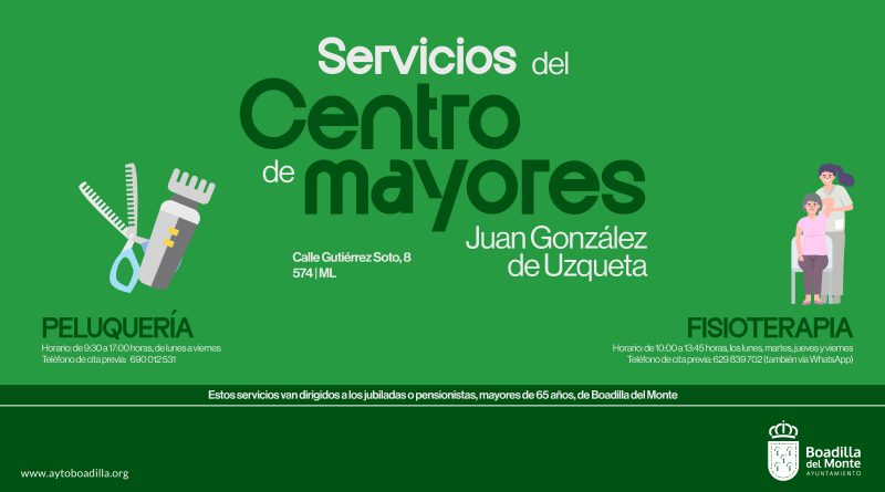 El Ayuntamiento de Boadilla del Monte pone a disposición de sus mayores una serie de servicios especializados para mejorar su bienestar y calidad de vida. Los vecinos empadronados mayores de 65 años, jubilados o pensionistas, pueden acceder a tratamientos de peluquería, podología y fisioterapia en los dos centros municipales de mayores.