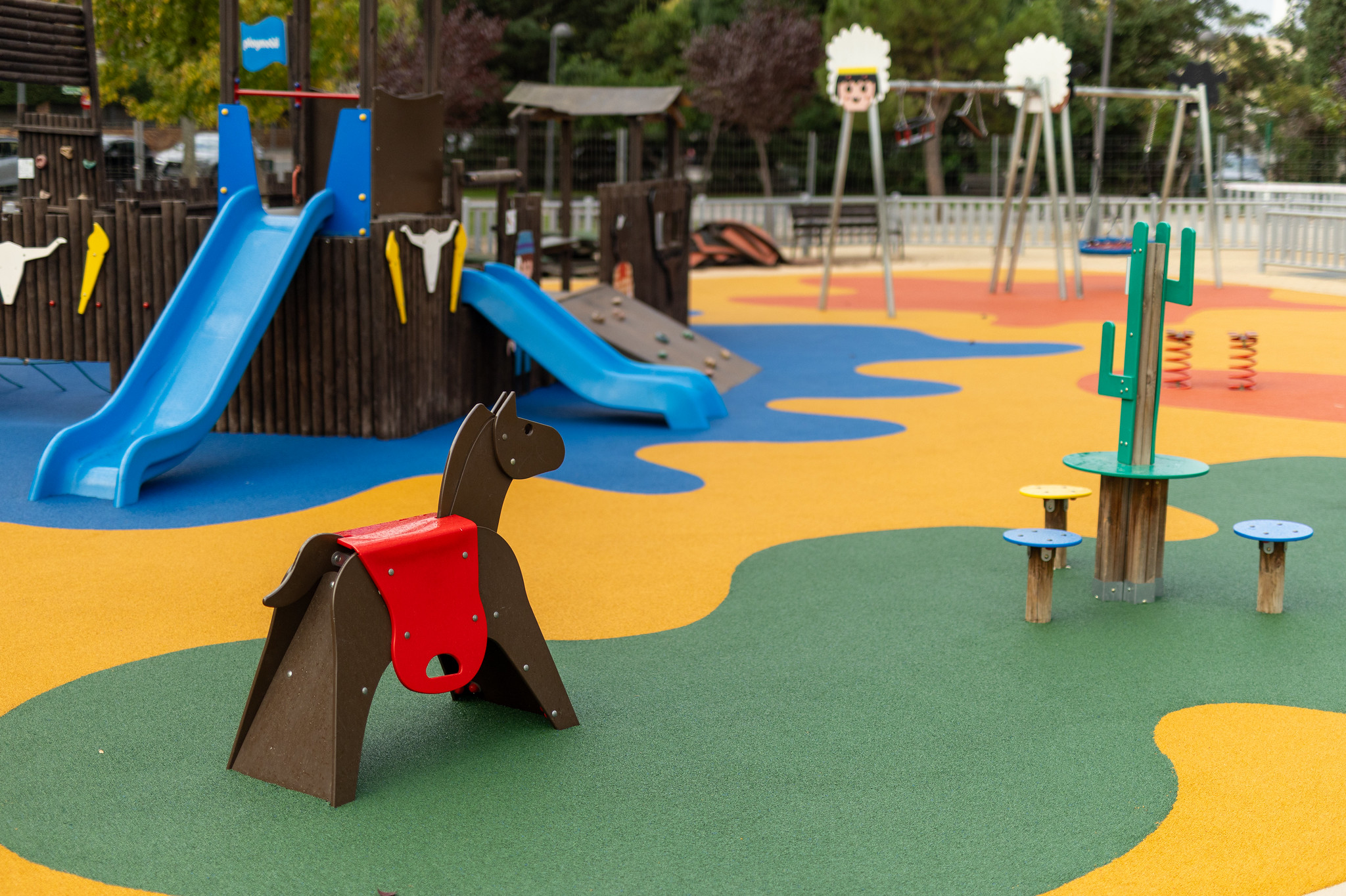 Los parques de Tomás Bretón y carretera de Villaviciosa se suman a la campaña de renovación del caucho que se está realizando en Boadilla, con la instalación de un material más resistente y seguro en las zonas infantiles.