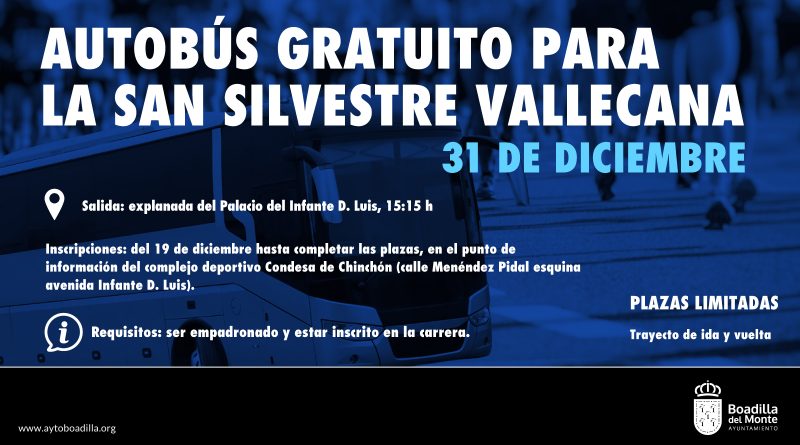 El Ayuntamiento de Boadilla del Monte pone a disposición de los vecinos empadronados que participen en la San Silvestre Vallecana un servicio gratuito de autobús, con trayecto de ida y vuelta, para facilitar el desplazamiento hasta el lugar de la carrera.