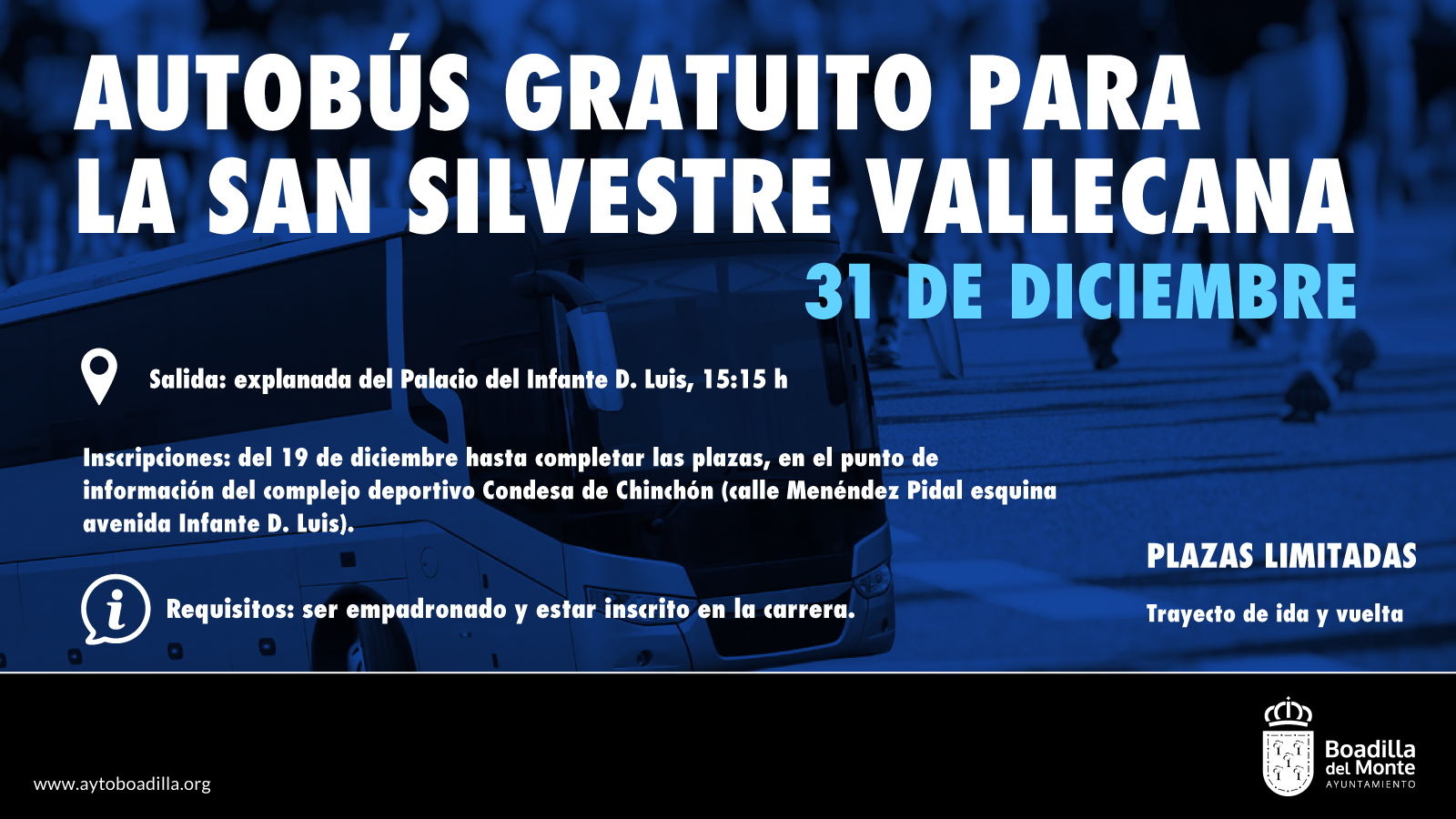 El Ayuntamiento de Boadilla del Monte pone a disposición de los vecinos empadronados que participen en la San Silvestre Vallecana un servicio gratuito de autobús, con trayecto de ida y vuelta, para facilitar el desplazamiento hasta el lugar de la carrera.