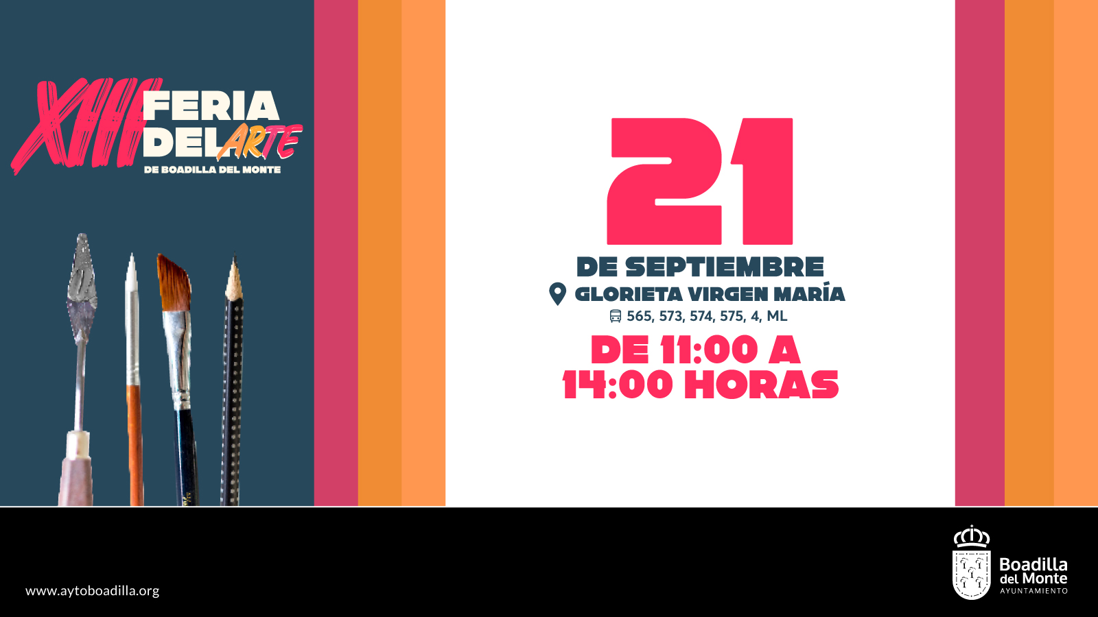 La glorieta Virgen María acogerá el próximo domingo 21 la XIII Feria del Arte de Boadilla, organizada por la Concejalía de Cultura. En las 30 casetas que habrá instaladas se mostrarán las obras de artistas residentes y empadronados en la localidad.